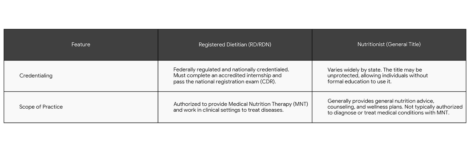 The short answer: All Registered Dietitians are nutritionists, but not all nutritionists are Registered Dietitians. The primary difference lies in regulation, education, and clinical authority. A Registered Dietitian (RD/RDN) is a legally protected title for a healthcare professional authorized to provide Medical Nutrition Therapy (MNT), whereas "Nutritionist" is a broader, often unregulated term used for general wellness advice.